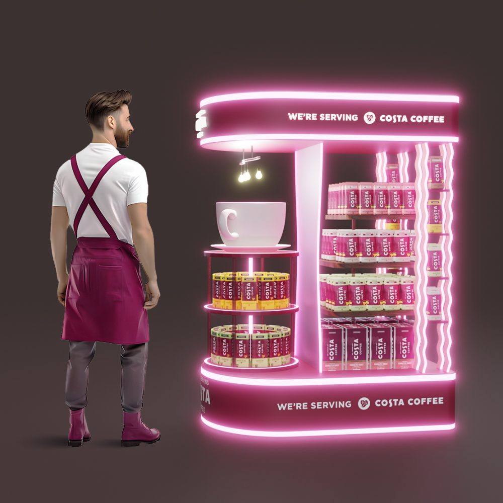 A representative zone of Costa Coffee with a rotating large coffee cup.